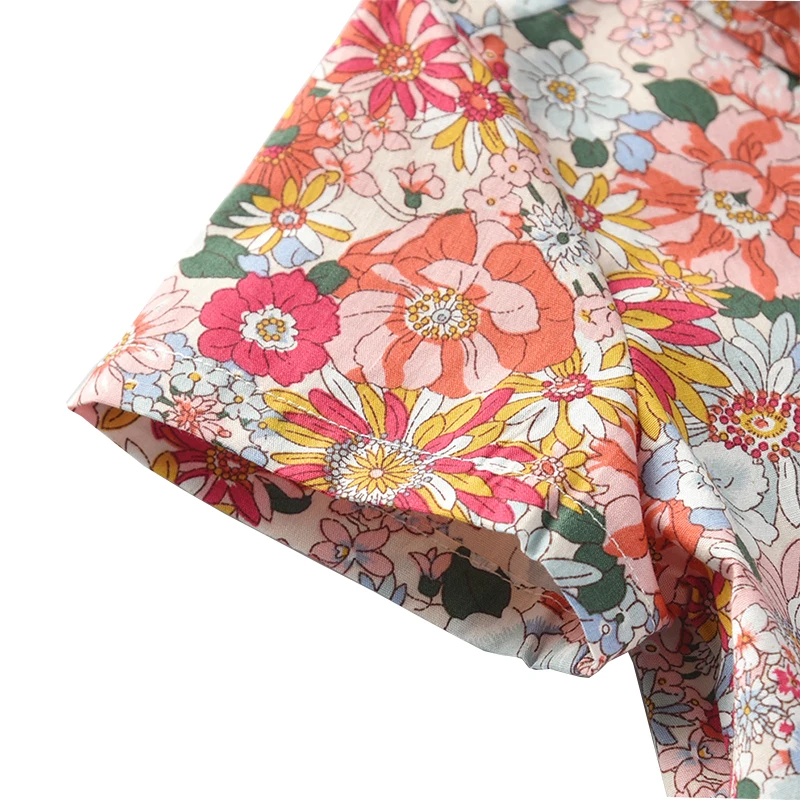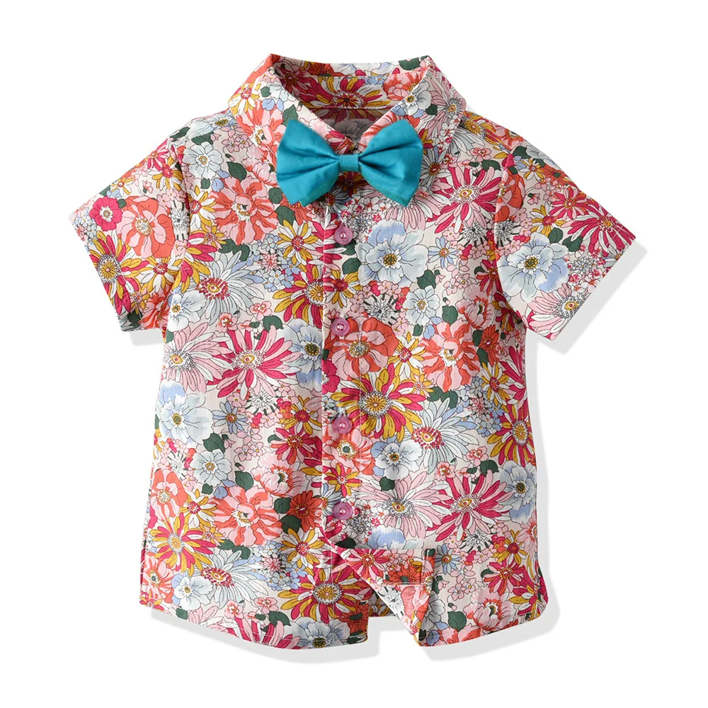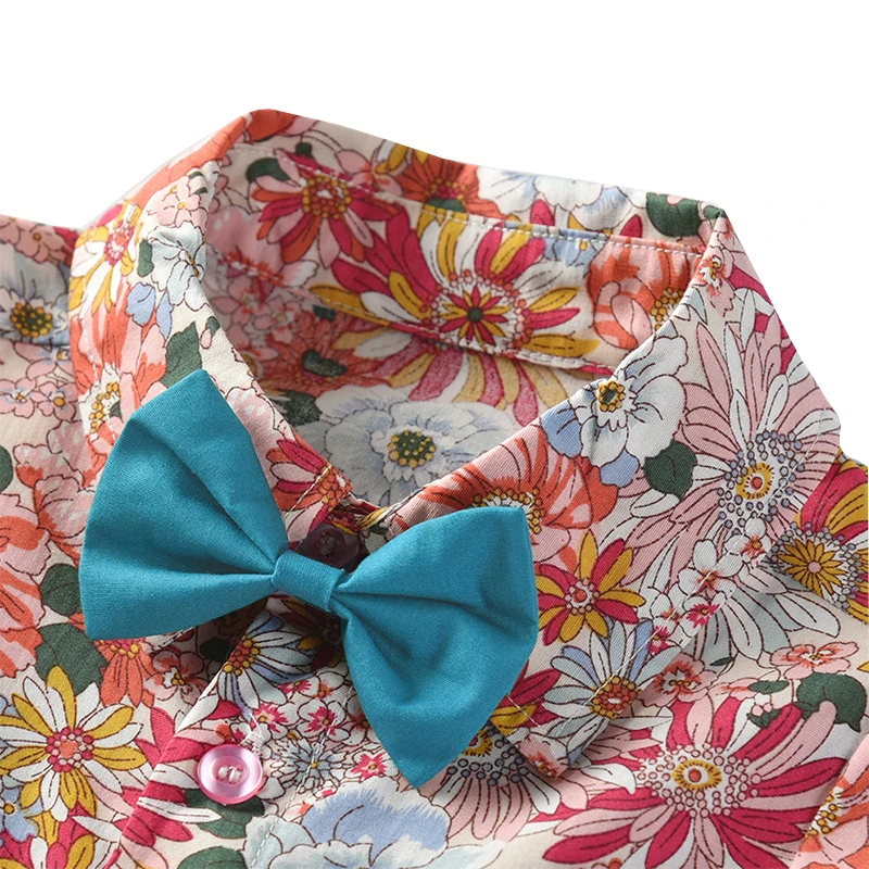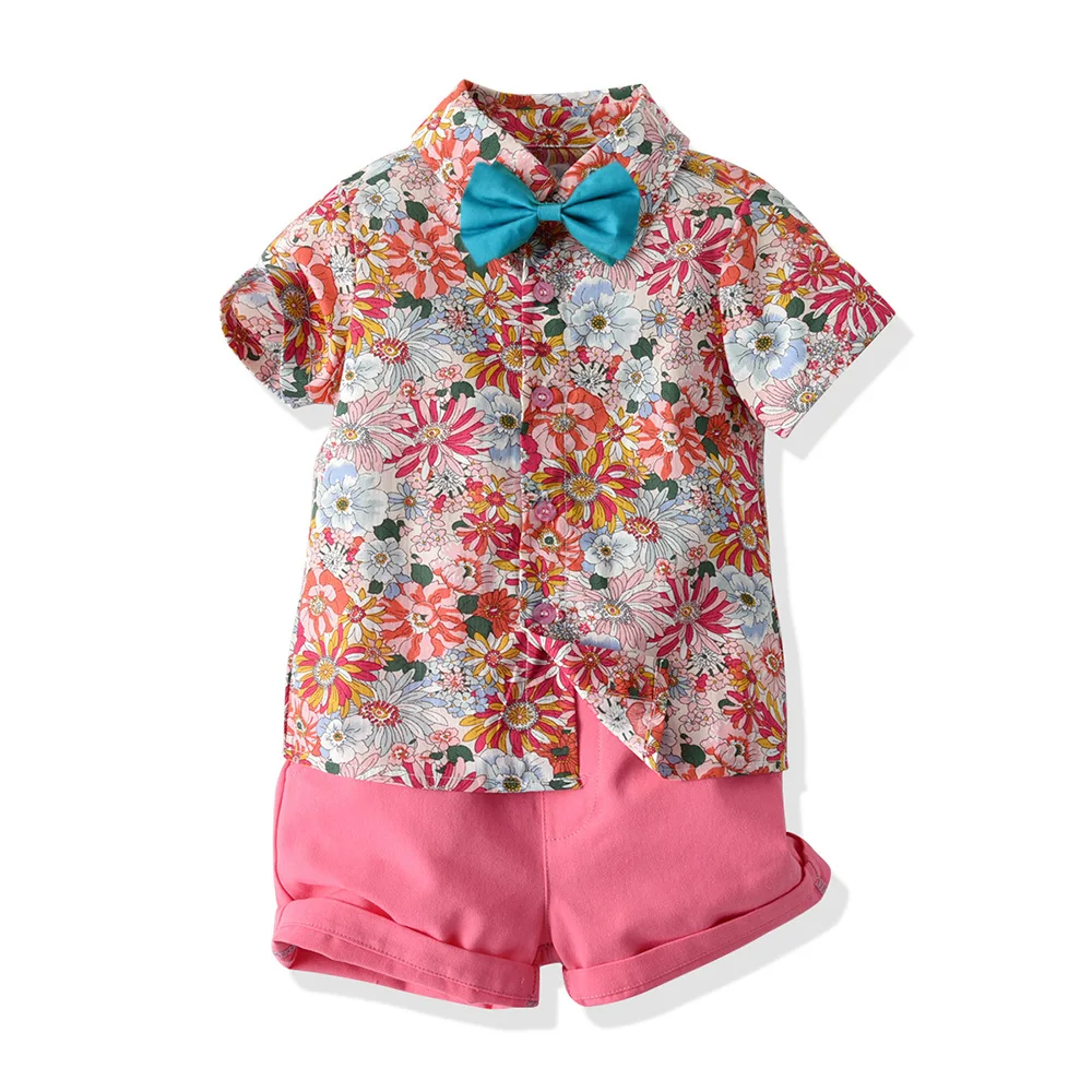 Cotton Fashion Kids Boys Clothing Summer Daily Casual Set Children Flowers Printed Shirt Pink Pants Suspender Bow 4 PCS Suit
