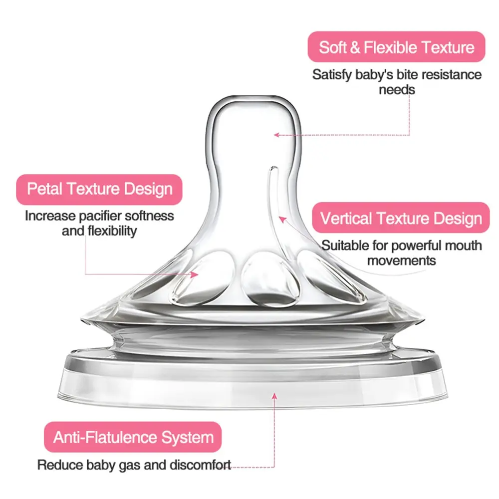 convex lines design so that it make the baby more comfortable when drinking. The teat is simulate