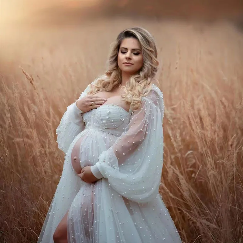 Maternity Photography Props Dress Dense Pearl White Yarn Maternity Photography Clothing Babyshower Gown Photo Shoot Pregnant