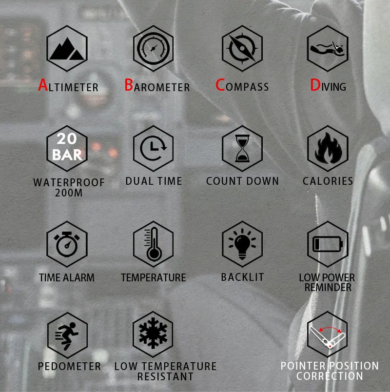 - Feature:Â STOP WATCH,Back Light,Shock Resistant,Repeater,Rattrapante,Luminous,Auto Date,Chronograph,Complete Calendar,Diver,Multiple Time Zone,Water Resistant,Alarm,swim,Week Display,Temperature Measurement,Pressure Measurement