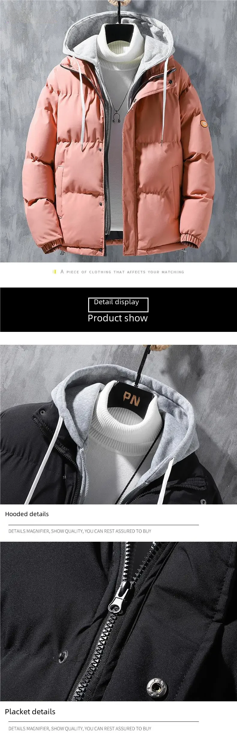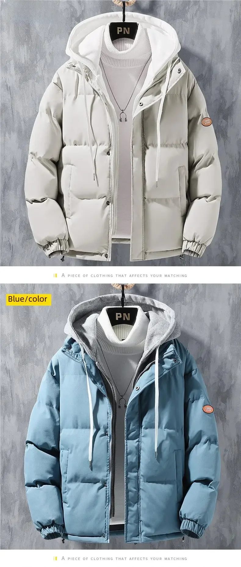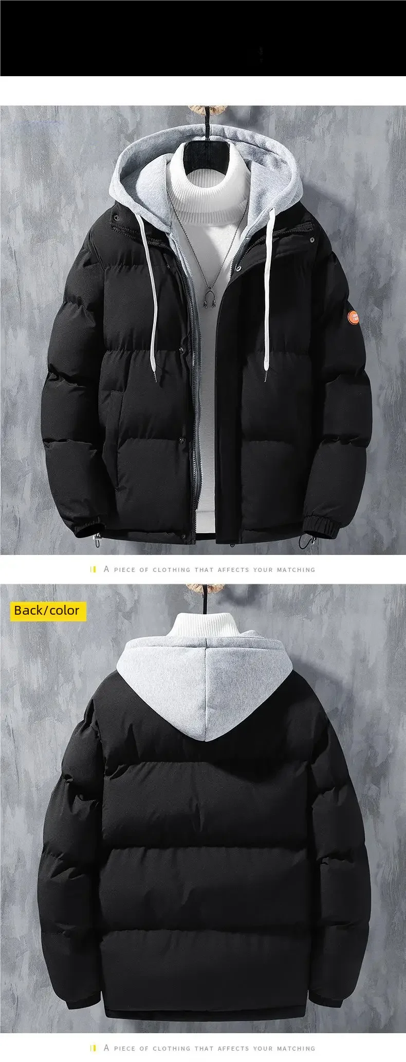 Winter Loose-fit Thickened Warm Cotton Coat Hood For Men Trendy Student Puffer Jacket Two-piece Illusion