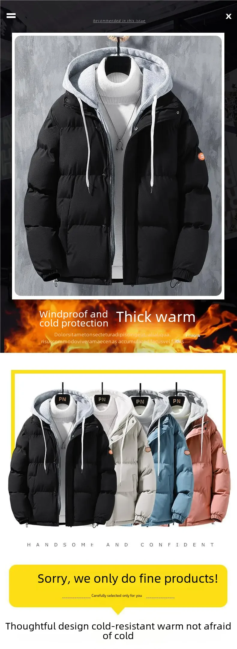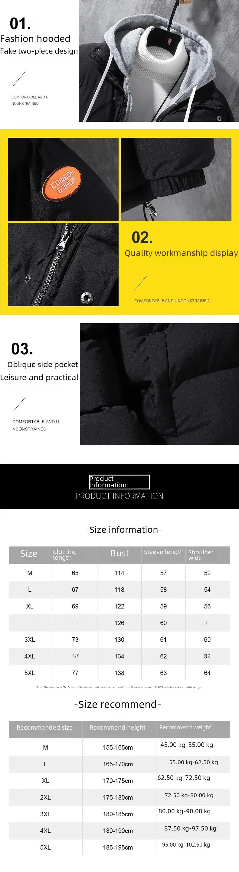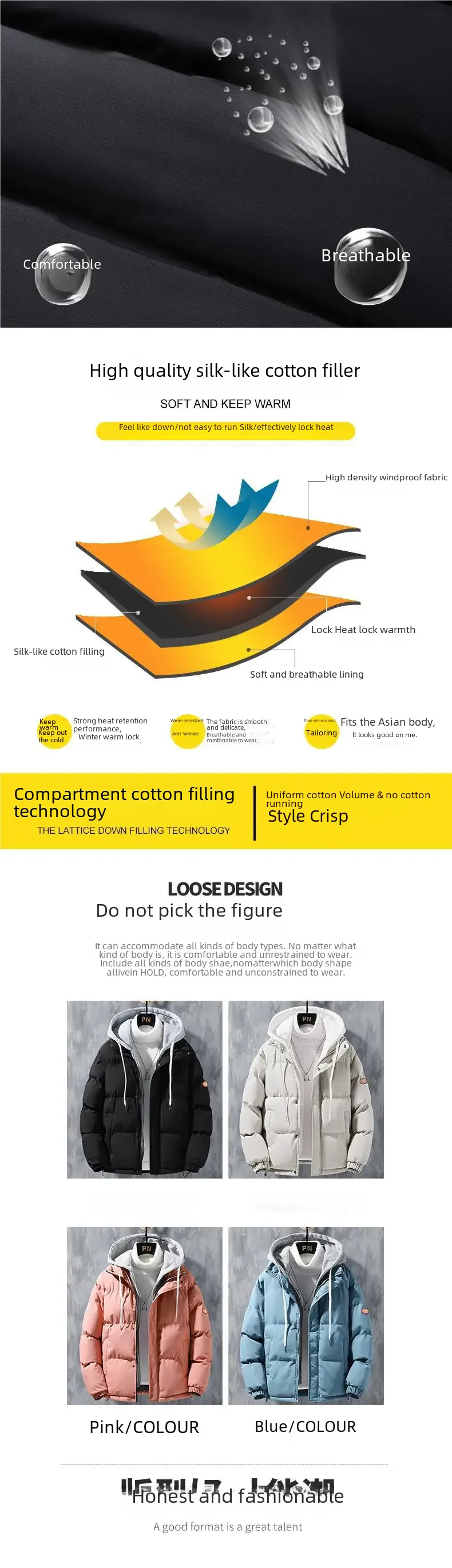 Winter Loose-fit Thickened Warm Cotton Coat Hood For Men Trendy Student Puffer Jacket Two-piece Illusion