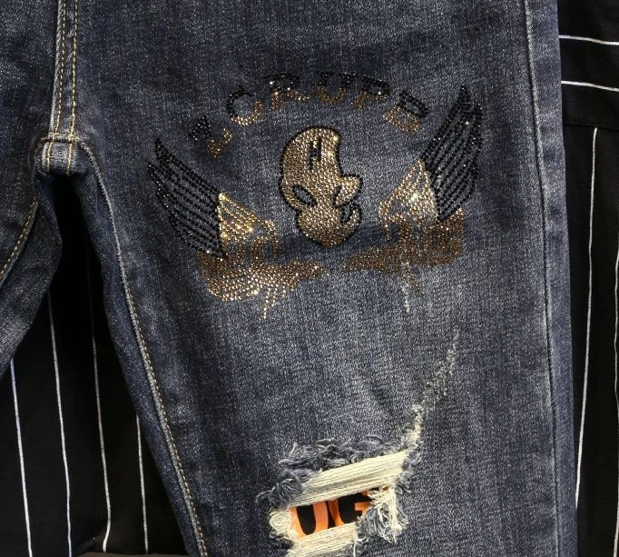 Trousers Tapered Broken Jeans for Men with Holes Male Cowboy Pants Ripped Torn Rhinestones Designer Korean Fashion Stylish Denim