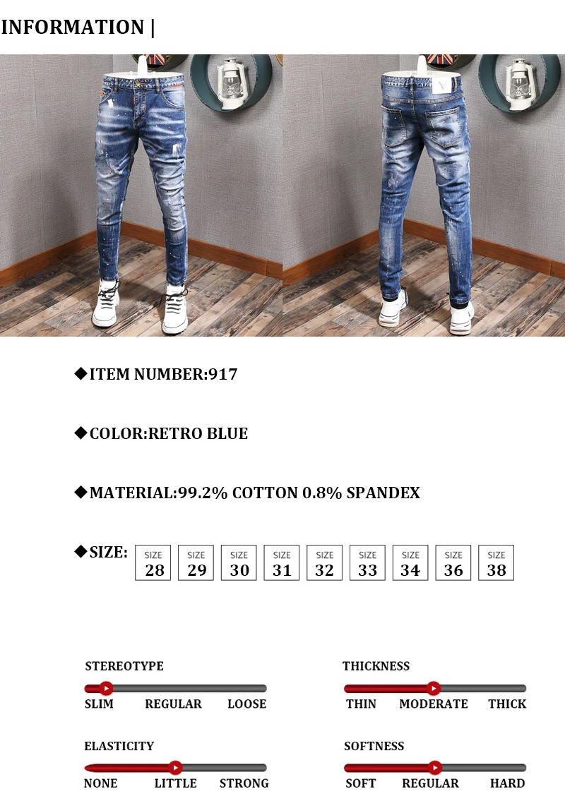Fashion Streetwear Men Jeans Retro Blue Elastic Slim Fit Ripped Jeans Men Painted Designer Elastic Hip Hop Denim Pencil Pants