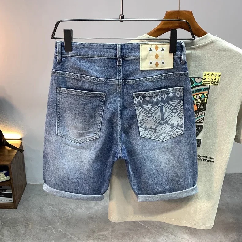 Trendy Denim Shorts Men’s 2024 Summer Lightweight Loose-fit Fashionable Printed Mid-waist Casual Style High-end Denim Jeans