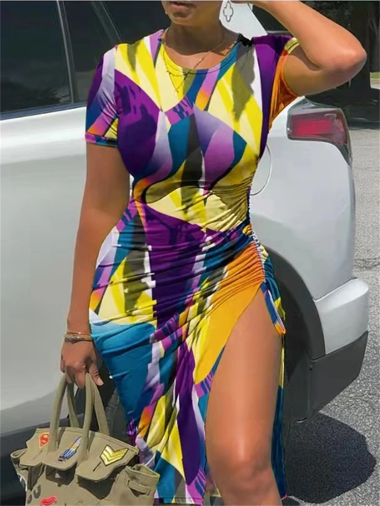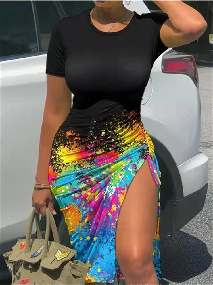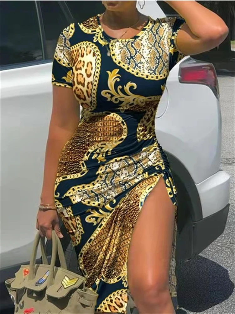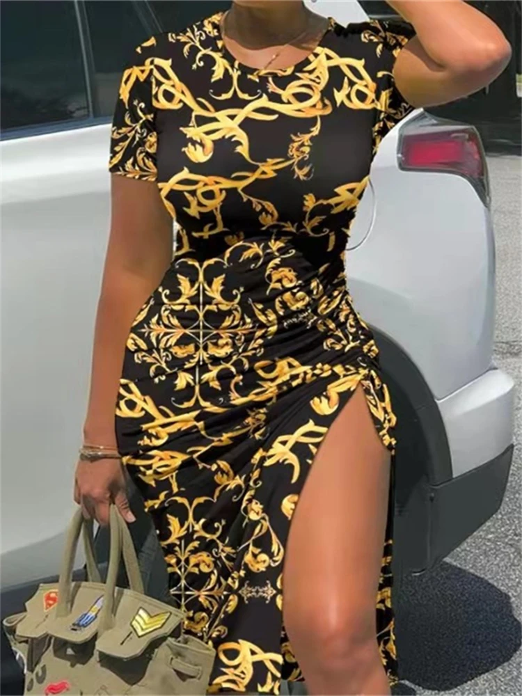 1140 reviews for FQLWL Black Bodycon Split Drsee Casual Club Outfit For Women 2024 Summer Short Sleeve O Neck Dress Fashion Print Pleated Dress