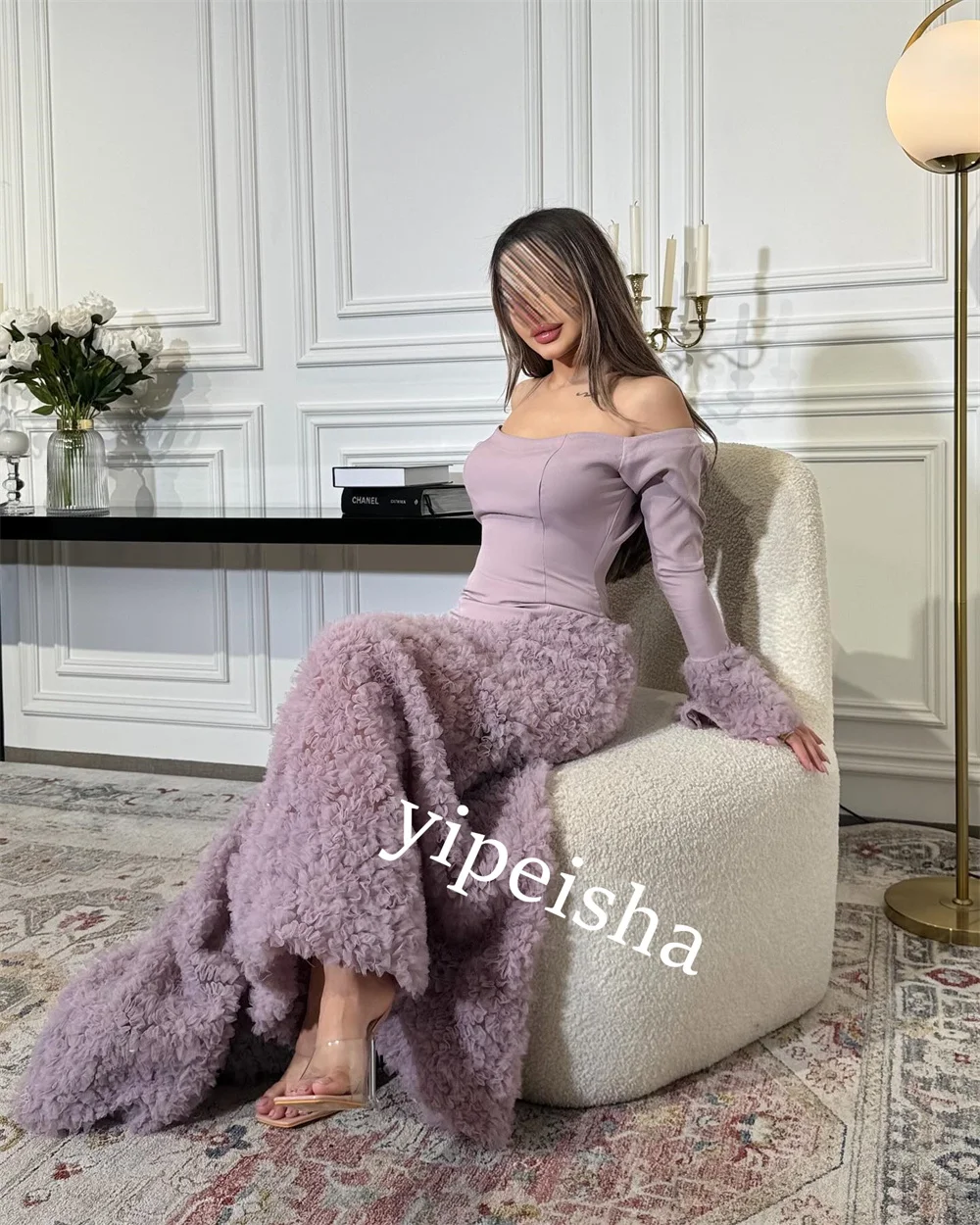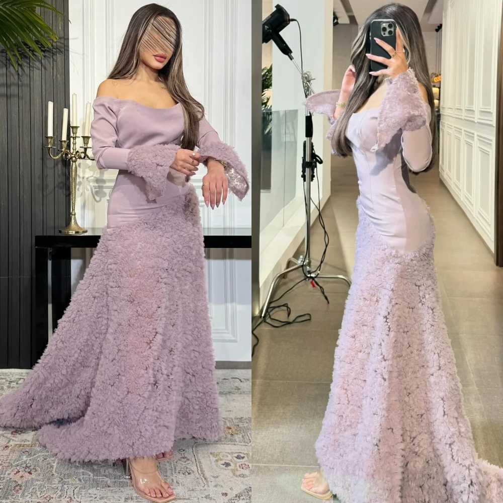 Prom Dress Saudi Arabia Jersey Flower Button Formal Evening A-line Boat Neck Bespoke Occasion Dress Anke Length