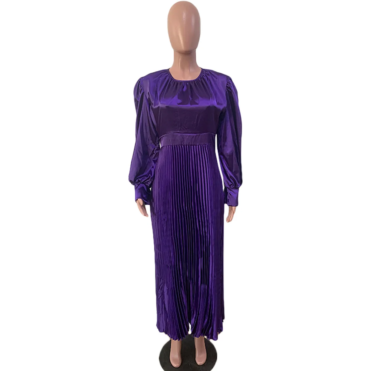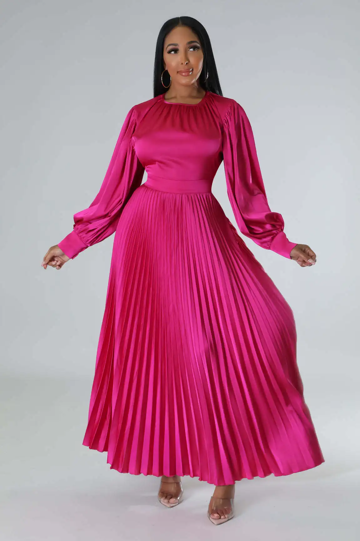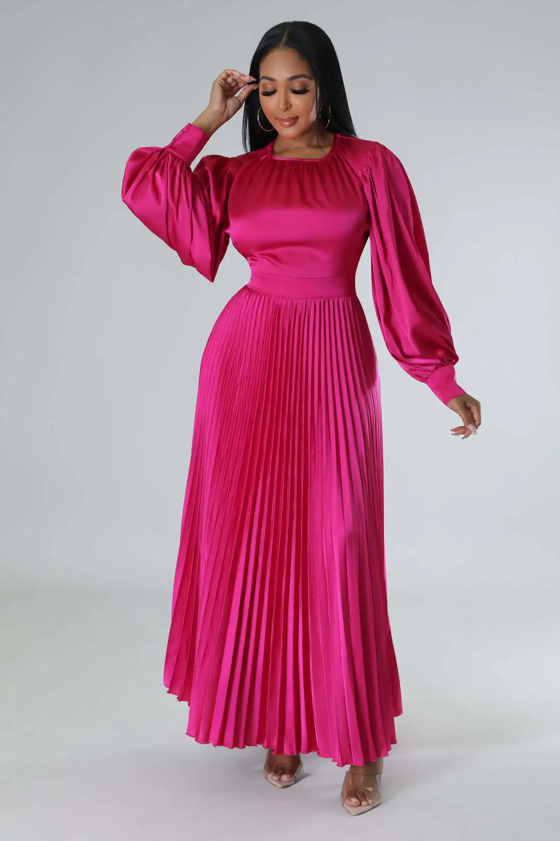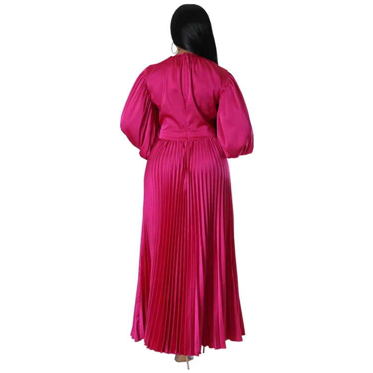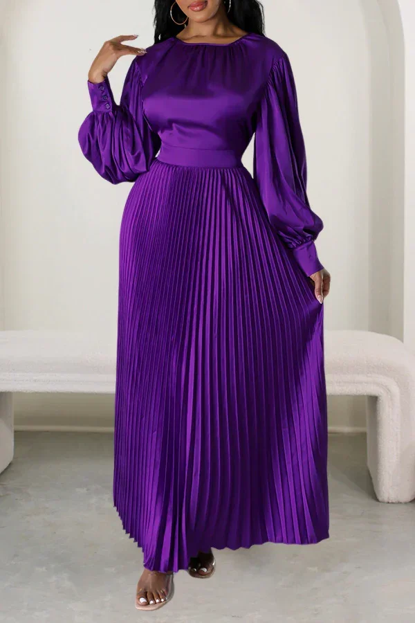 2024 Spring Pleated Loose Fit Maxi Dresses Women Solid Ruched Lantern Sleeve Party Evening Wedding Long Dress Women