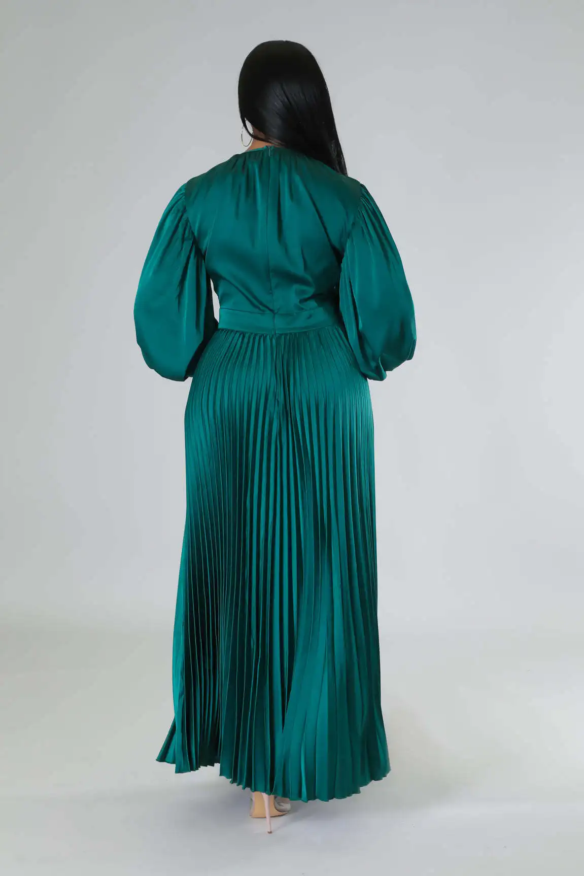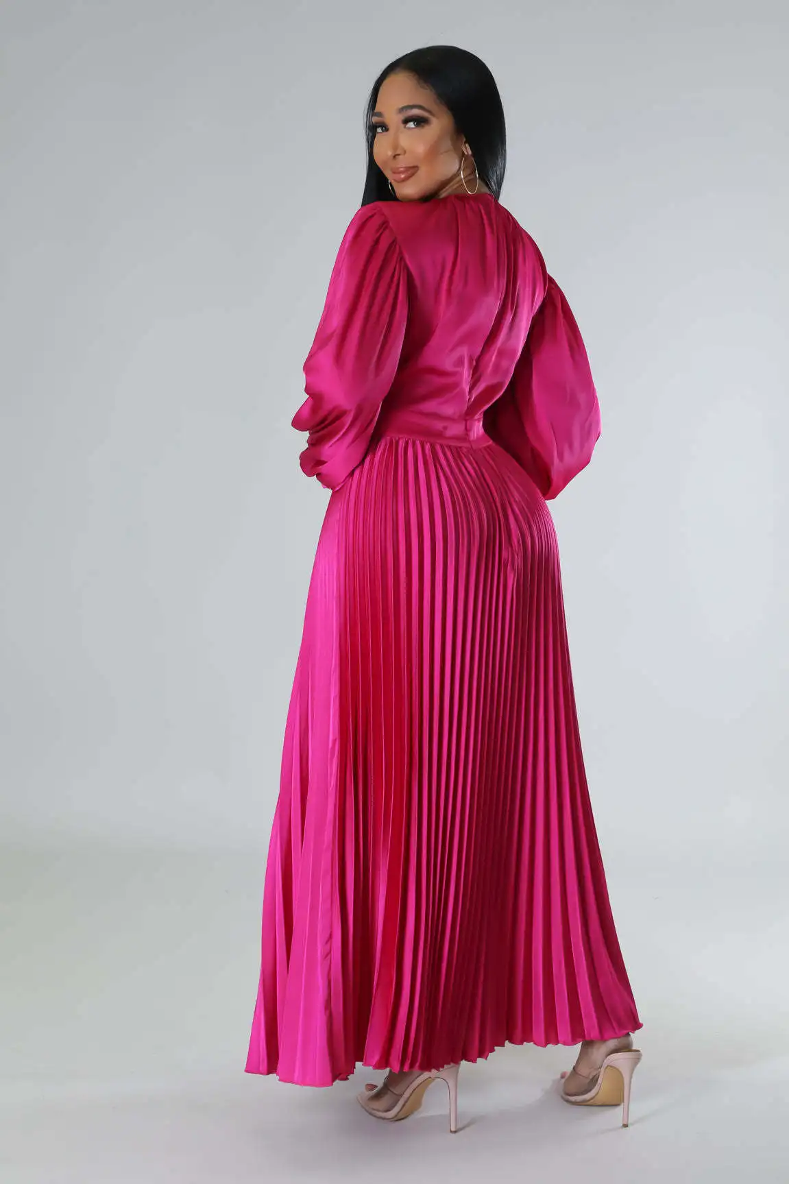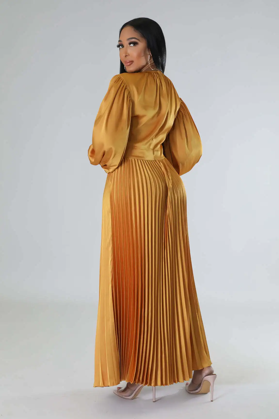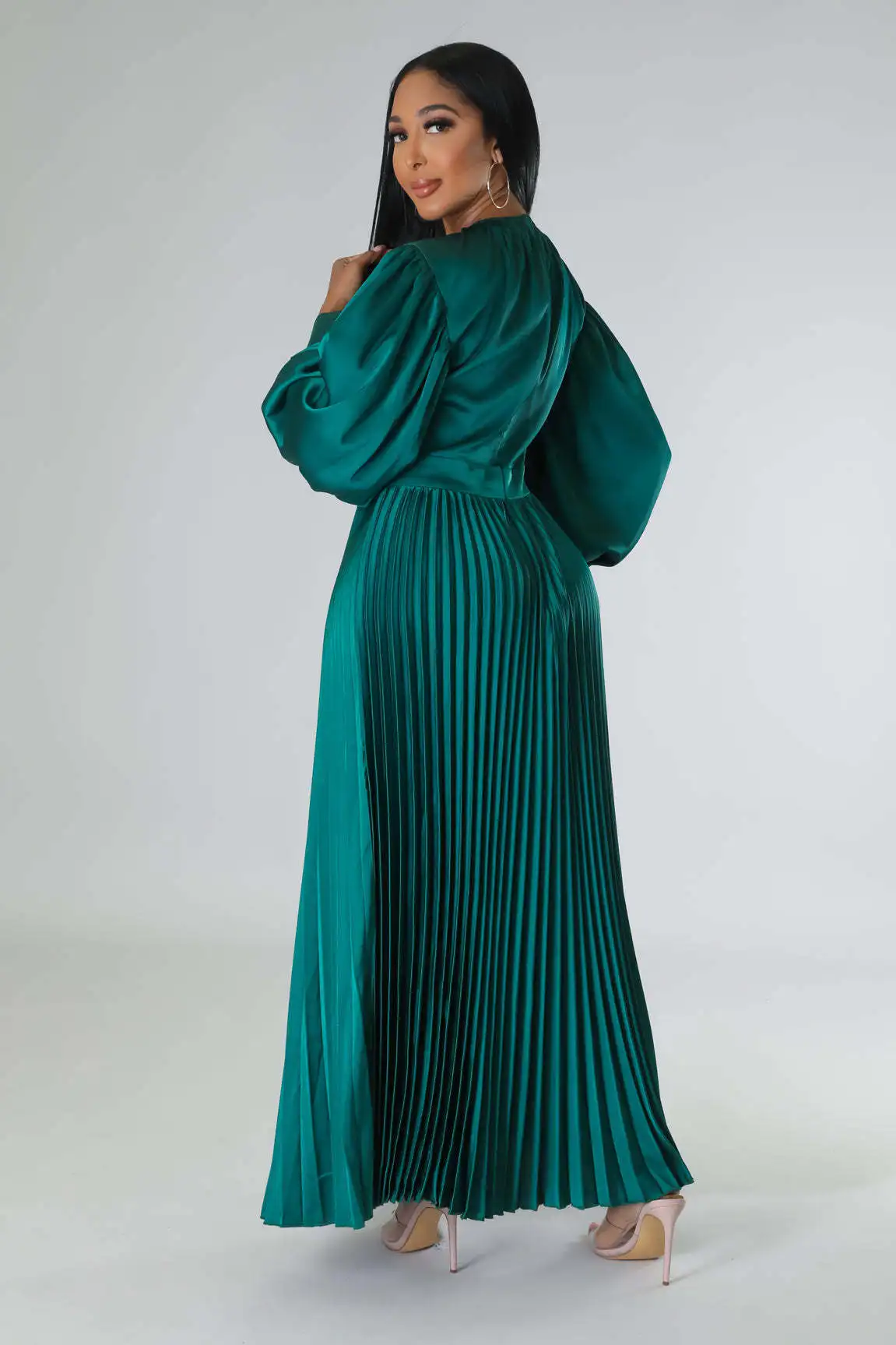 2024 Spring Pleated Loose Fit Maxi Dresses Women Solid Ruched Lantern Sleeve Party Evening Wedding Long Dress Women