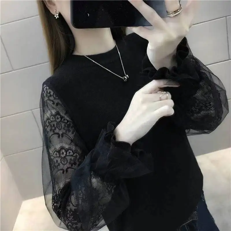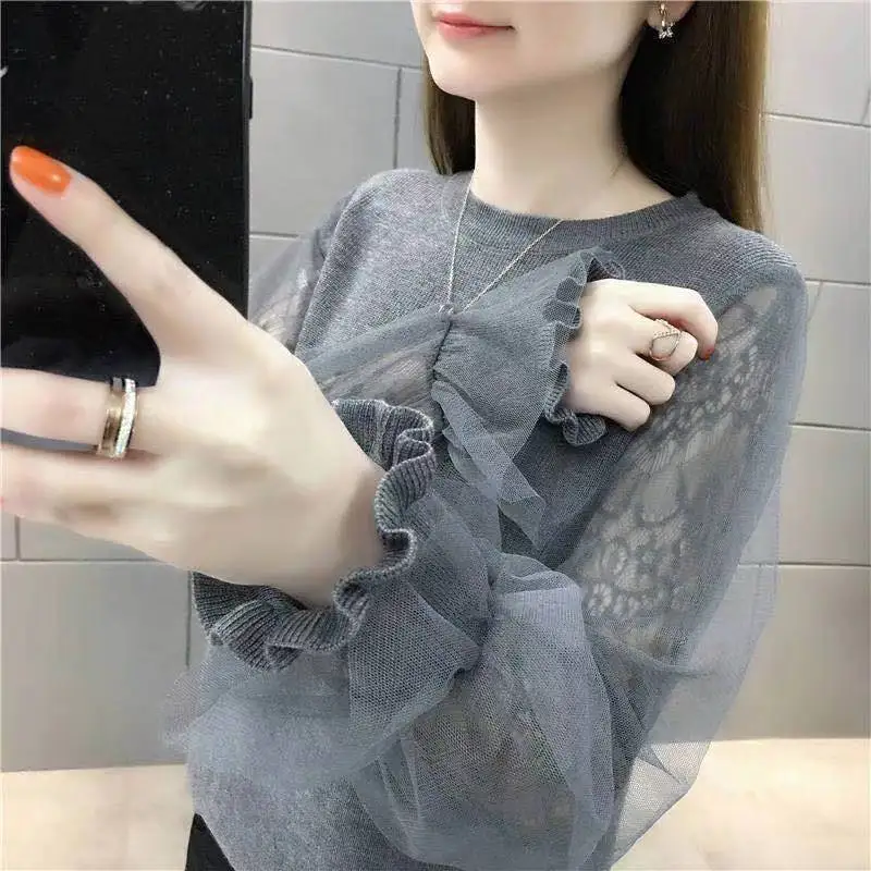 Women’s 2023 New Trendy Sweater Women’s Spring and Autumn Age Reducing Loose Mesh Lace Sleeves Knitwear Thin Style