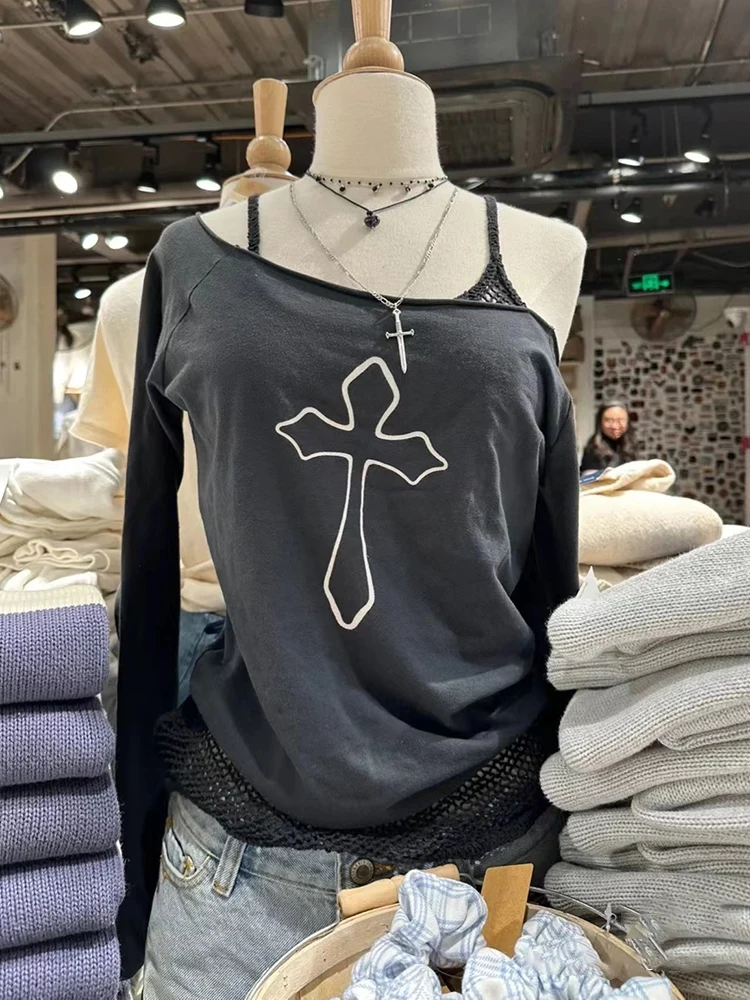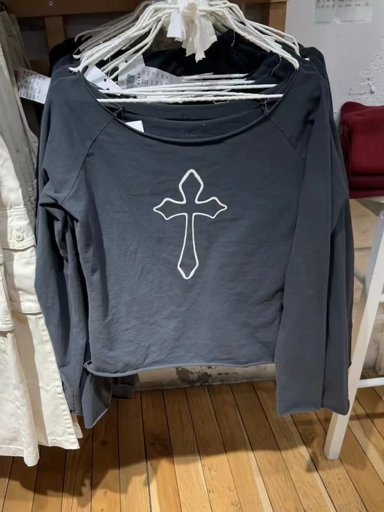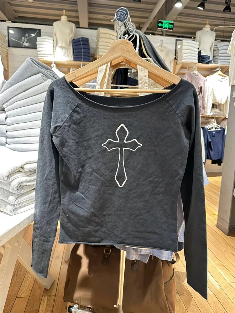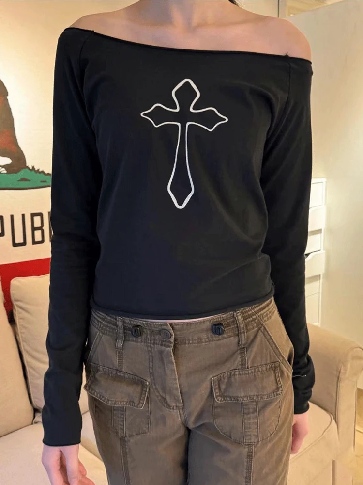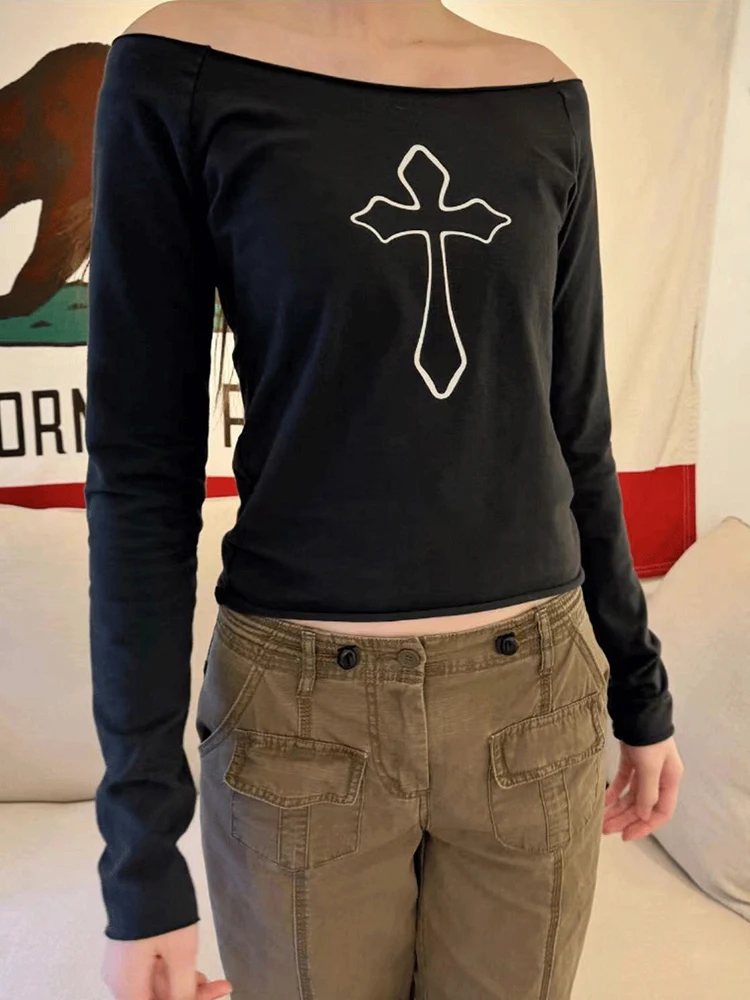 Black Cross Print Raw Trim T Shirt Women Summer Sexy Slash Neck Cotton Long Sleeve Tees Streetwear Vintage Casual T-shirts Y2k